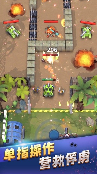 在游戏中,驾驶战车不断击退敌人,用炮弹炸开小房子,营救房子里面的俘虏,登上你的战车,护送到飞机场。boss来袭,你的行动要快,速战速决,不能恋战,恋战容易让你被包围,这样就不容易躲避boss的攻击了。