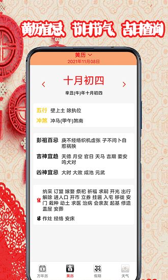 黄历宜忌、节日节气、吉日查询、历史查询;