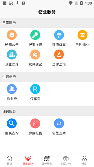 1、整个物业功能分类明了,用户能够很快找到所需功能服务;