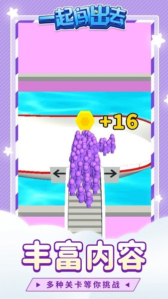 《一起闯出去》是一款轻松休闲的小游戏。简单操作,让更多的小人通过马路,搭上轮船,一起闯出去!上手特别容易,操作也特别的简单,但是也抵挡不住它的好玩哦,玩家可以自由的选择小人的颜色,操控小人不断的前进。