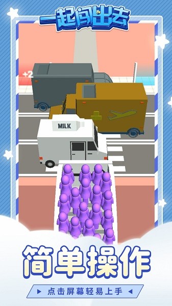 一起闯出去,魔性的过马路游戏,游戏中玩家需要操控一堆小人不断沿着一个方向前进,游戏中玩家需要通过多个公路路段,路上有一系列行车干扰,玩家需要确保小人都能安全通过马路,成功登船,游戏颇具挑战性,感兴趣的玩家可以下载体验一下!