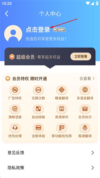 2、在个人中心页面找到“点击登录”区域,点击该区域进入手机号登录界面。