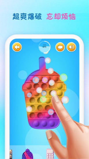 可以选择各种不同的泡泡模板进行体验,点击鼓起的泡泡可以将其压下去,快速的滑动点击将其全部压完之后可以将其反面再次挤压,可以更换鱼、爱心、恐龙等各种模板,保证放松。
