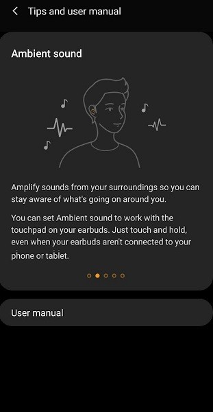 在设定EQ后,APP中你会看到有一个环境声接收的选项。由于入耳式耳机会隔绝了许多外来的环境声,跟人聊天或者是想听广播的话就得要除下来。由于Galaxy Buds内外皆有一对MIC作收音之用,启动接收环境声后就会使用外边的mic收音,实时将环境声传入你耳内,更可以调校接收多少环境声。