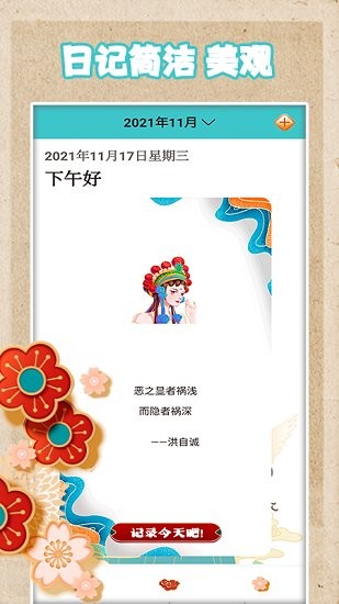 日记本本为用户带来古风风格的日记本软件,软件之中包含了许多的古典风格,让用户可以随时在好看的日记本APP之中记录自己的日记,古风的风格让你的日记本更加充满文艺气息。