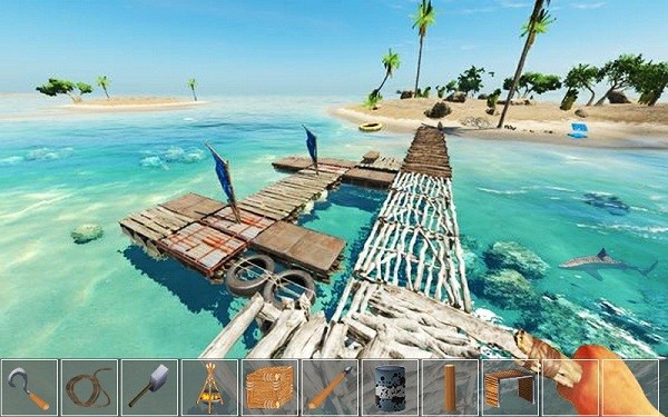 在游戏中不断的冒险,抢夺更多的资源,建立自己的木筏,小心的在船上求得生存。