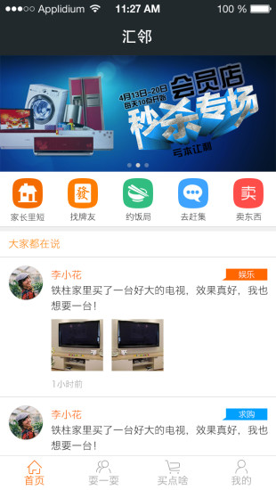汇邻,专为农民开发的电商和社交平台。提供多种互动与购物方式,通过整合各地乡镇家电零售商资源,帮助乡村用户上网,实现线上线下互通。