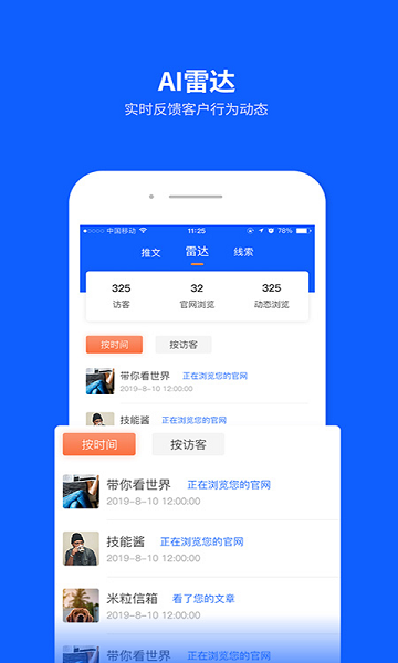 实时反馈名片、获客内容的浏览行为,谁看过你,看过什么,看了多久都能即时知道,实时跟进名片分享轨迹和转化效率,精准数据助力销售,判断与客户的亲疏远近;详细的用户行为分析、为销售打造个人主页及选择获客内容,提供数据参考