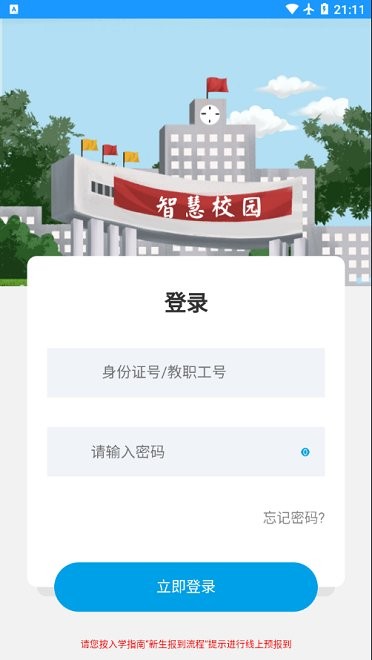 学生打开迎新网站首页点击右上角“报到登录”按钮,跳转到输入用户名密码页面,输入学号和身份证后六位登录系统。