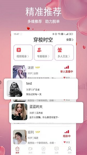 穿梭时空app给用户带来趣味的交友生活体验,视频相亲交友,动态的社区让你发表心情文字图片等让人更好的了解你,自由的添加好友管理信息通讯非常的方便,有需要的用户就来下载试试吧!