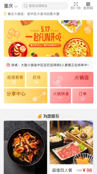 2、有很多可以让用户进行参考购买的火锅超值套餐,用户还可以在线的进行火锅拼桌等等功能使用的预定,让用户足不出户就可以安排好餐饮行程;