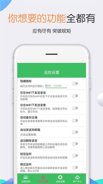 应有尽有突破规矩,通话录音、微信聊天记录、地理位置都可以开启监控,多种套餐可供选择,符合客户不同的需求,免费试用版、家庭版、企业版、旗舰版。