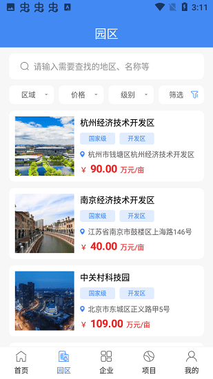 企政通官方版带给用户最丰富的市场信息,平台收录了全国各地区园区、企业、项目的相关资讯,用户可以搜索了解;同时软件上还有热门推荐,帮助大家及时了解详情。还可以在线认证园区企业信息,欢迎有需要的用户下载企政通app使用。