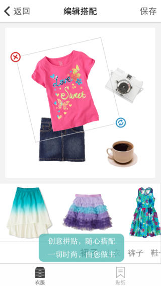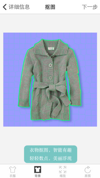 2.高效有趣的抠图工具:自动将照片中的衣饰和背景区分开来,提炼出清晰的衣饰模块供您轻点几下优化效果,便于搭配以及分享。