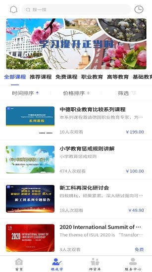 1、展示了我们的师资力量,视频中精选出的课程,以及微课程,让老师在移动应用中,继续学习,互相交流,共同提高。。