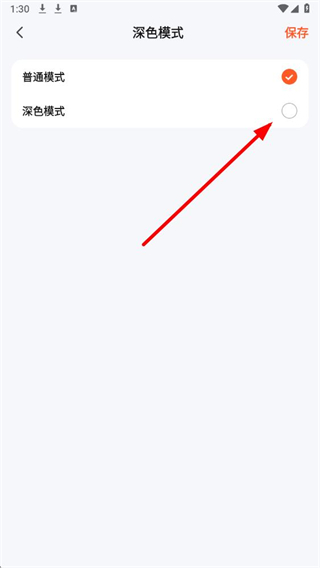 4、在深色模式页面,选择深色模式对应的选项,再点击右上角的保存,即可完成深色模式的设置。