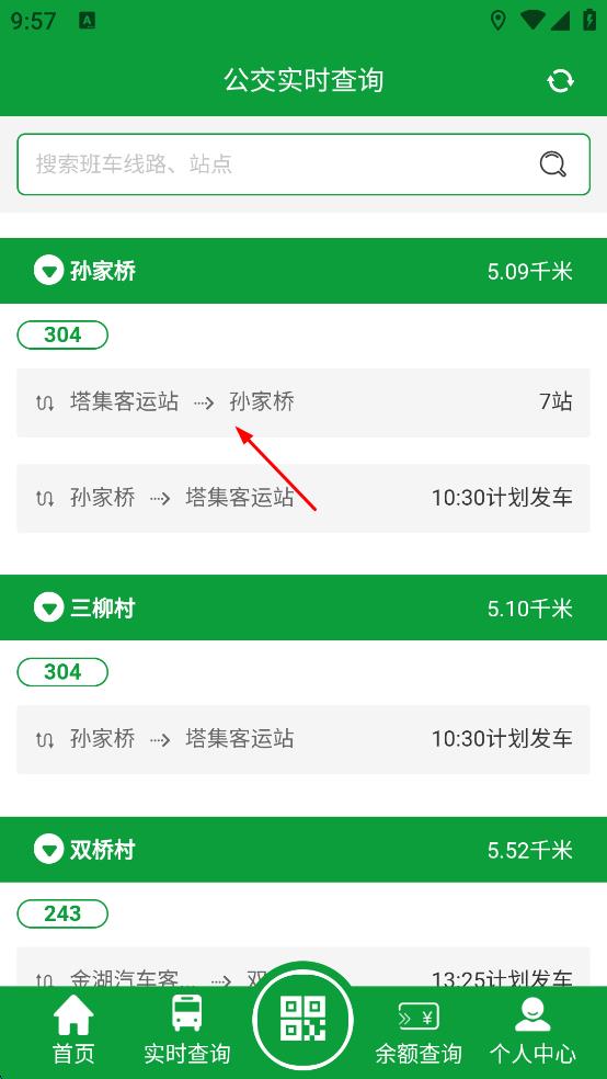 3、在公交实时查询页面,可搜索班车线路或站点,也可直接选择想要查询的公交路线,比如点击304路塔集客运站到孙家桥的线路。