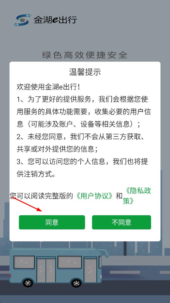 1、打开金湖e出行应用,在温馨提示界面,点击同意,进入应用主界面。