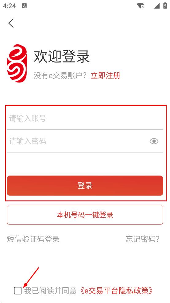 4、在登录界面,勾选我已阅读并同意e交易平台隐私政策,输入账号和密码,点击“登录”。
