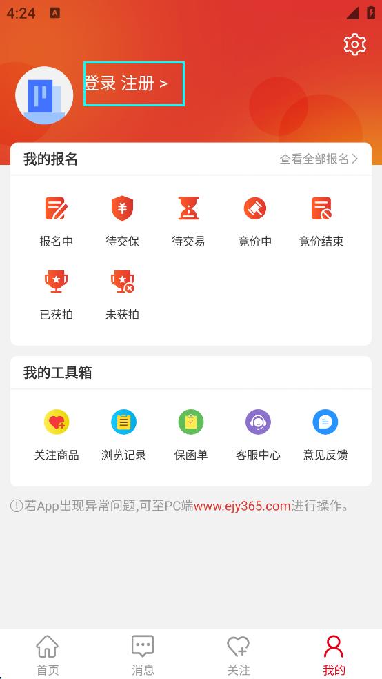 3、在个人页面,点击“登录 注册”,进入登录界面。