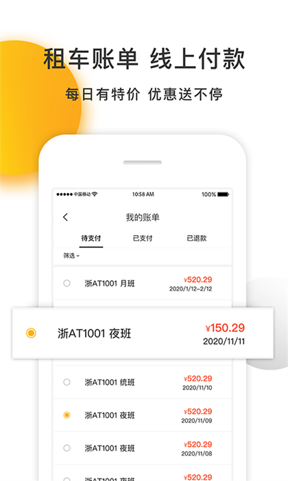 2.租车账单,线上付款,每日有特价,优惠送不停;