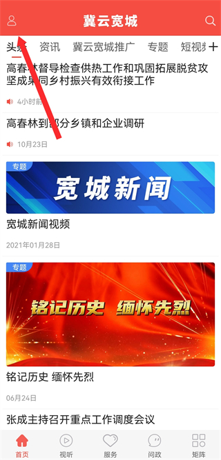 1、打开冀云宽城APP首页,点击左上角个人中心入口,进入个人页面。