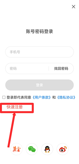3、在登录注册选择界面,点击快速注册,进入账号注册信息填写页面。