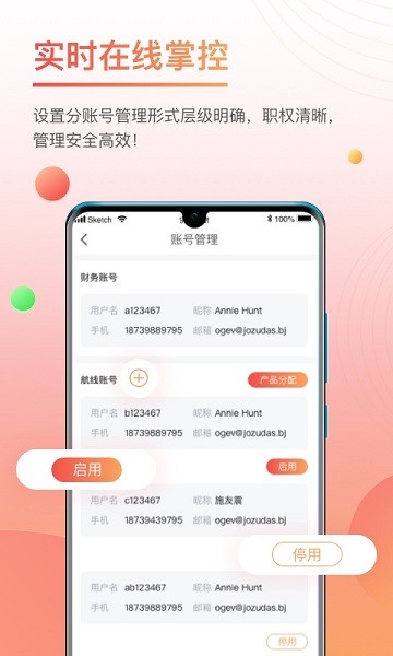 2、实时在线掌控,设置分账号管理形式层级明确,取权清晰,管理安全高效;