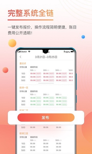 1、完整系统全链,一键发布报价,操作流程简明便捷,账目费用公开透明;