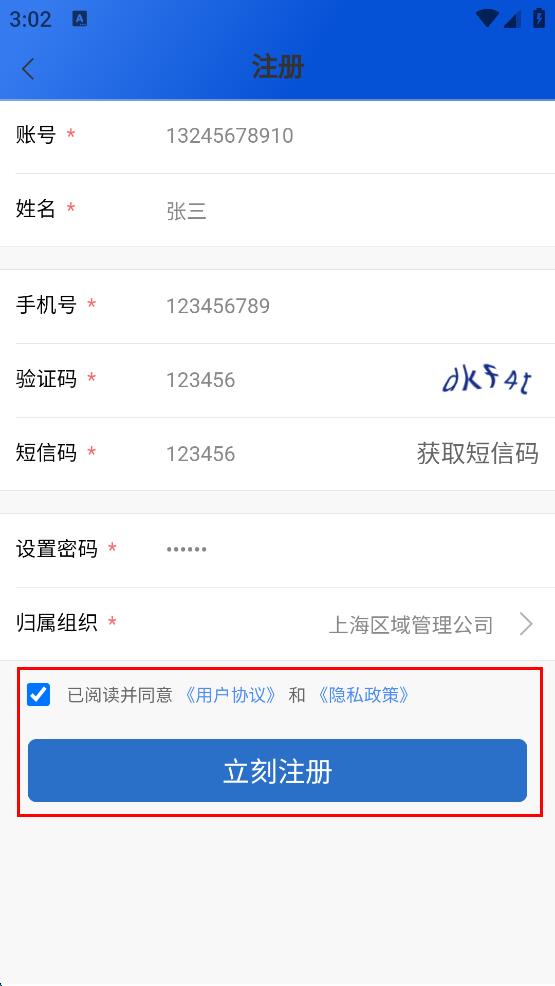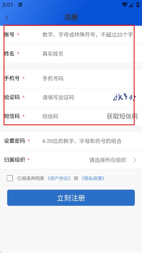 3、在注册页面依次输入账号、姓名、手机号、验证码、短信码,设置密码并选择归属组织。