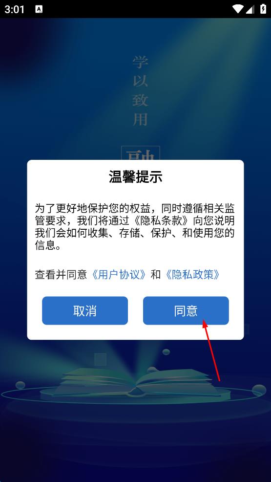 1、打开融通i学堂App,出现温馨提示弹窗,阅读后点击同意按钮。
