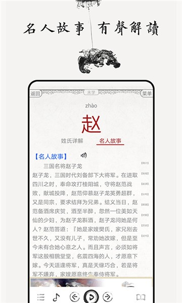 每个姓氏汉字都有读音、释义、繁体、和相对应的名人故事。让孩子学国学之余,随时积累识字量和了解古代各个姓氏的名人故事!