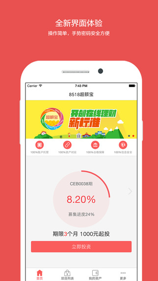 8518超额宝ios版是一款金融理财类手机软件,投资产品种类丰富,收益有保障,自助式帮助体验让用户更快上手,资产分类详细,账户资金随时可查,期限灵活,还有超多优惠等着你哦,欢迎大家下载体验!