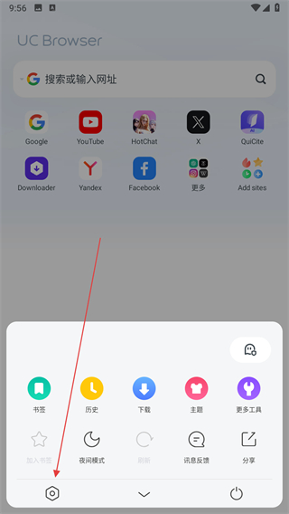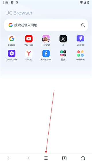 1、打开UC浏览器国际版软件进入主界面,点击底部导航栏中类似三条横线的菜单按钮,展开更多功能选项。