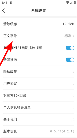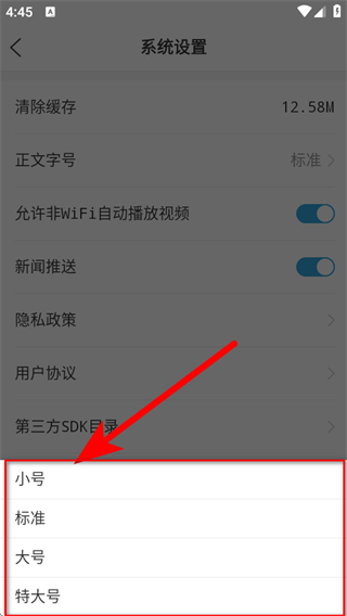 3、在系统设置界面点击正文字号,弹出包含字体大小的选项列表。