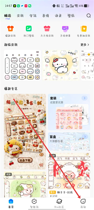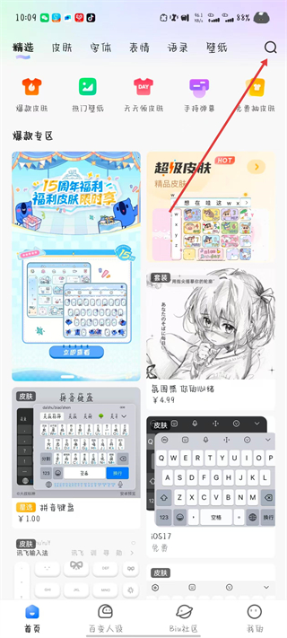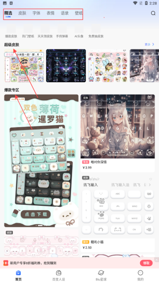 1、打开讯飞输入法进入相关界面,点击顶部皮肤选项,可在超级皮肤和爆款专区等板块浏览各种风格的键盘皮肤,像卡通、炫酷等风格,找到喜欢的皮肤后点击下载。