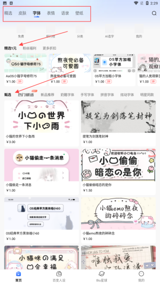 2、点击顶部字体选项,能看到精选1元,甄选等分类,里面有可爱圆、手写字体等多种字体,部分字体可能需要支付购买,选择心仪字体后按提示操作。