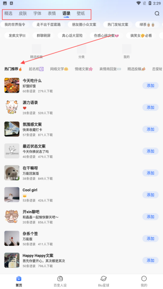 3、点击顶部语录选项,在热门推荐等分类下,有各种类型的文案语录,比如美食相关的今天吃什么、氛围感文案等,点击添加将感兴趣的语录添加到输入法。