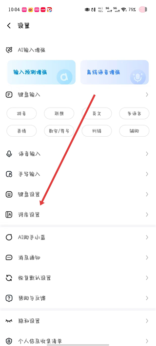 2、在设置页面中,找到词库设置选项并点击,进入词库管理界面。