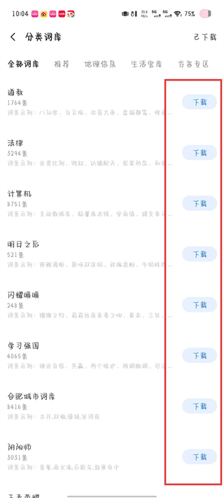 4、在分类词库页面,找到想要下载的词库,点击对应词库的下载。