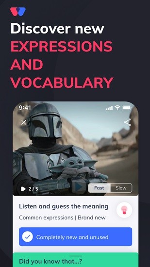 你最好的语言老师可以是你最喜欢的节目通过使用流行文化的短片训练您的听力、发音和词汇,掌握一门在现实生活中使用的外语。目前可在 英语 和 西班牙语. 更多语言即将推出。