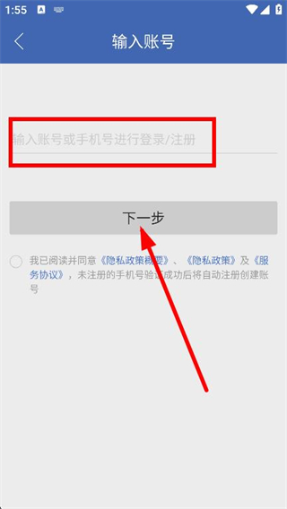 3、在输入账号页面,填写账号或手机号,点击下一步。