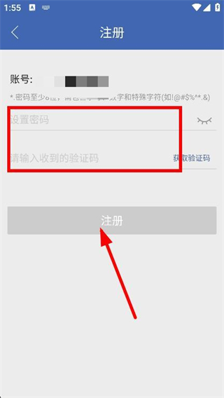 4、设置密码,填写验证码,点击注册,完成账号登录。