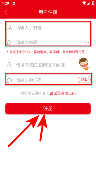 4、在用户注册页面,依次输入手机号等信息后,点击注册完成操作。
