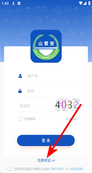 1、打开山餐安APP,在登录界面点击注册验证,进入企业注册页面。