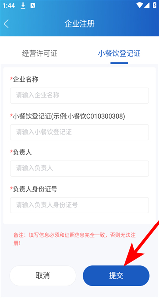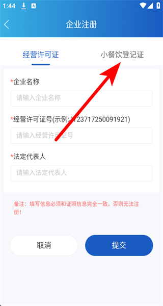 2、在企业注册页面,点击小餐饮登记证选项卡,切换到小餐饮登记证注册界面。