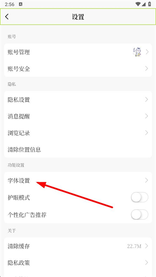3、在设置界面里,点击字体设置选项,进入字体设置页面。