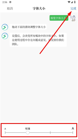 5、在页面下方,拖动底部滑块调整字体大小后,点击右上角完成即可。