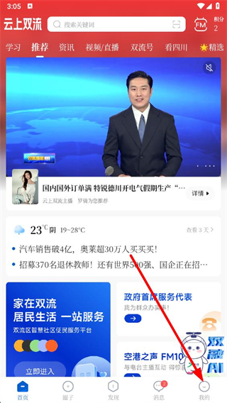 1、在云上双流app首页,点击右下角我的,进入个人页面。