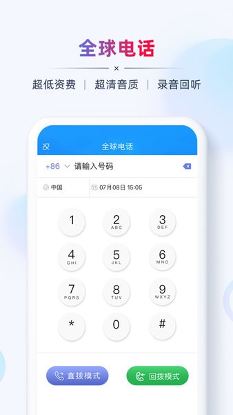 全球电话高清对话费用低,自动录音,去电显号;全球通话,保证质量;无漫游和最低消费。